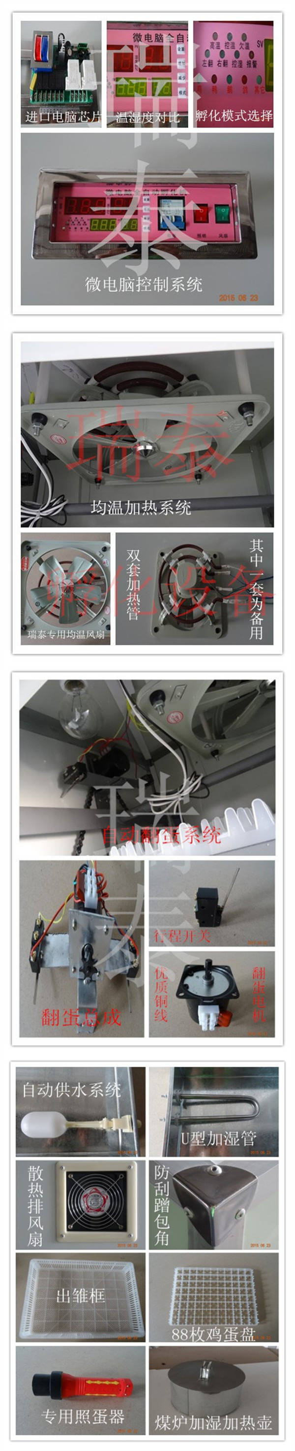 ●瑞泰高擋系列數碼顯示,自動控溫、報警、翻蛋、均溫、供濕、消毒、供水、煤電兩用。智能電腦全自動控制,箱式蛋架車結構,采用加固改進工藝,能同時孵化、出雛,可以分多批上蛋入孵